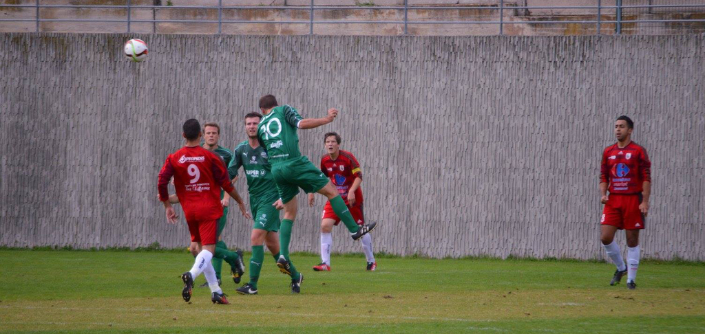 Jamais inquiétés dans la première demi-heure, hormis sur quelques ballons longs cafouillés dans la surface, les Verts vont logiquement ouvrir le score. Lancé sur son côté droit, Fabien "Poussin" Jouve adresse un bon centre pied droit dans la surface. Quentin Courbet prend le dessus sur son défenseur et vient placer une tête piquée croisée qui vient terminer sa course dans les filets.